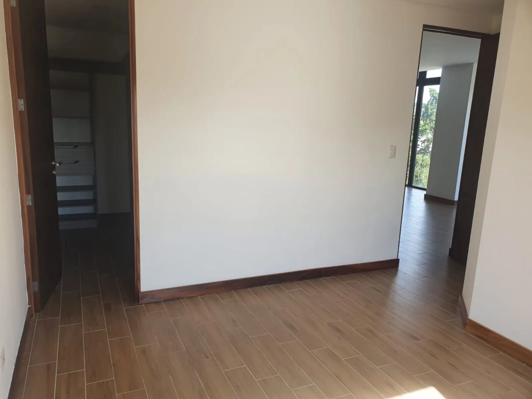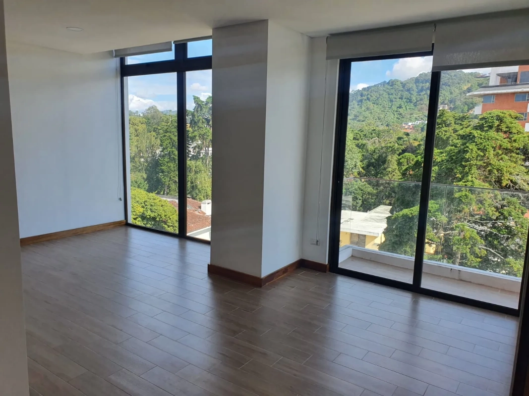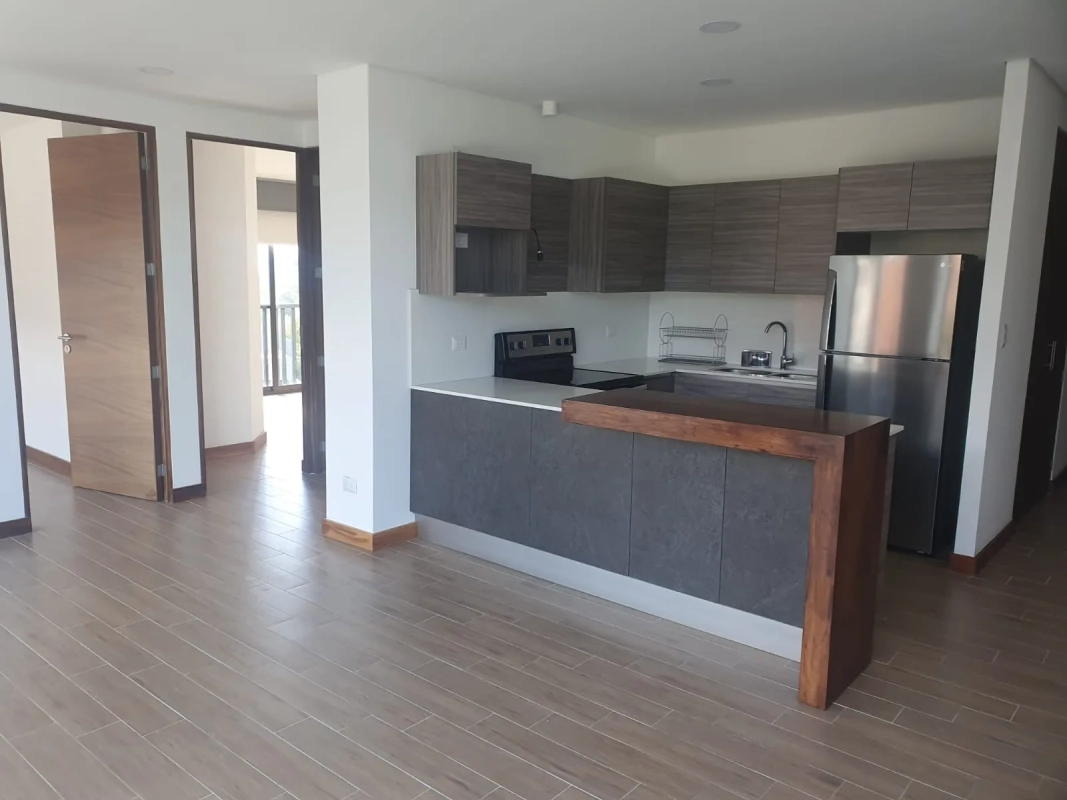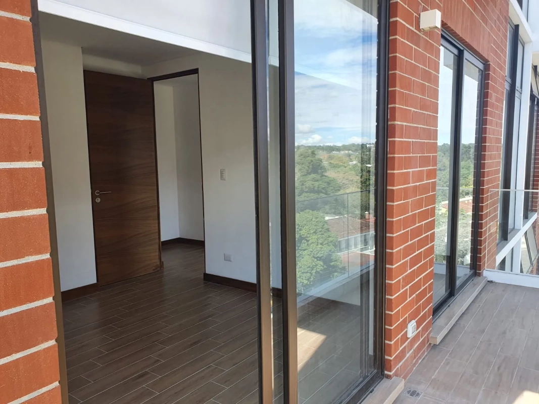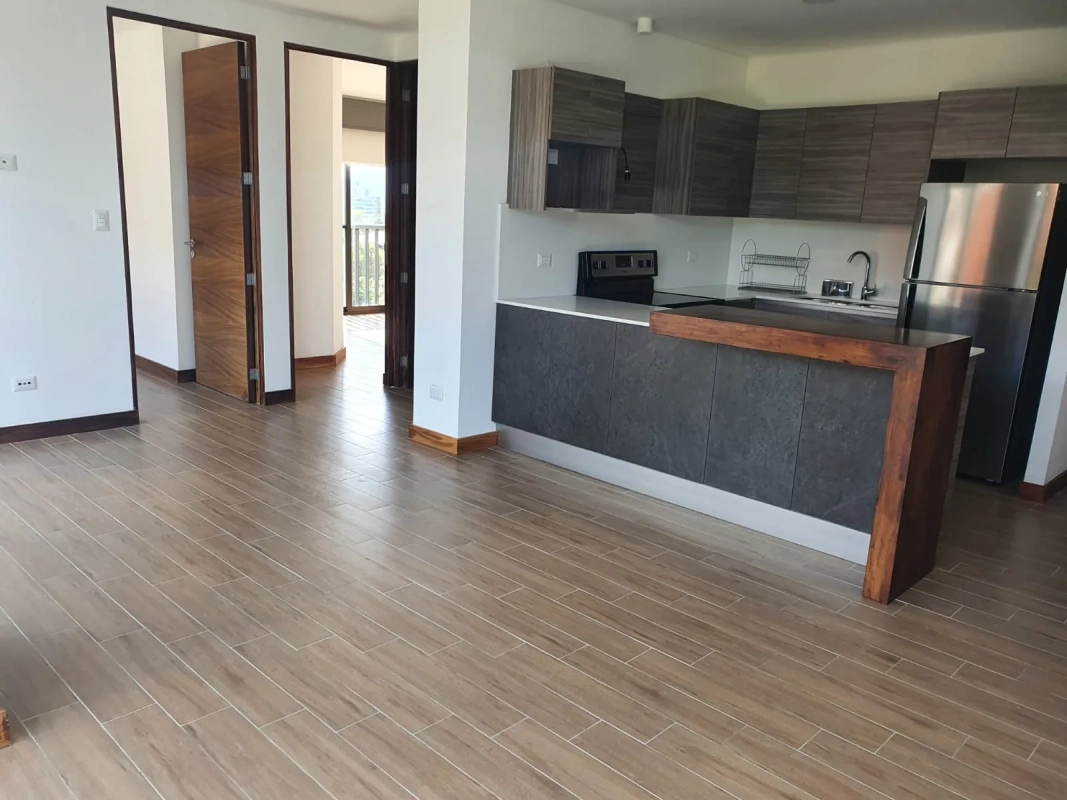 Apartamento de 2 habitaciones cada una con closet y balcón francés, habitación principal con baño integrado, sala con balcón y cocina abierta, 2 parqueos y bodega.