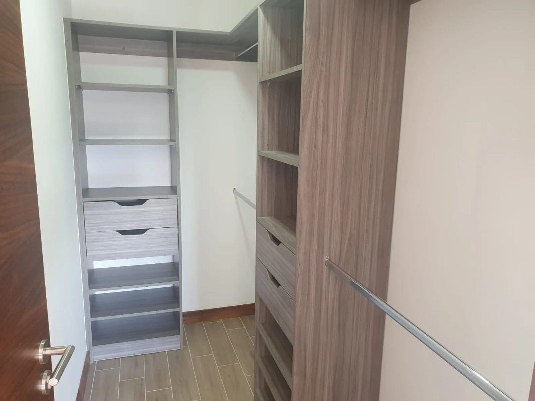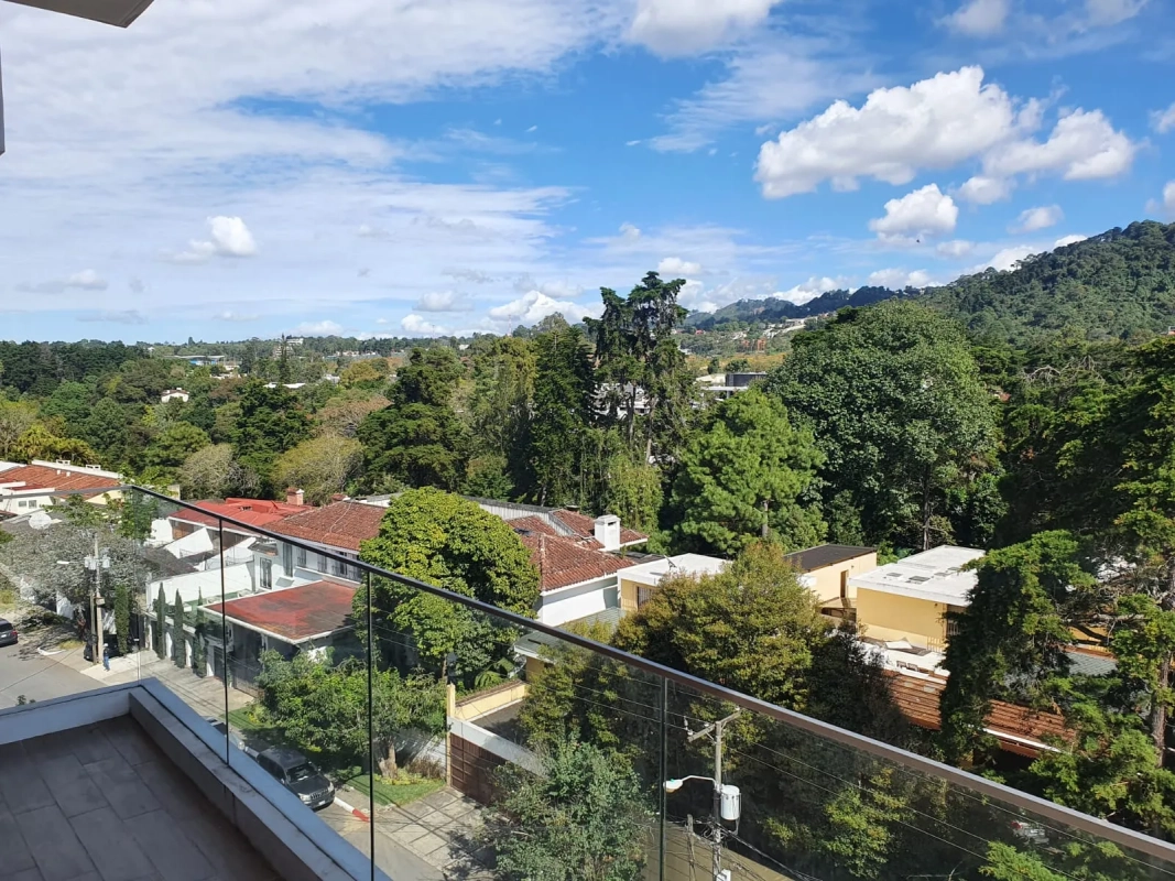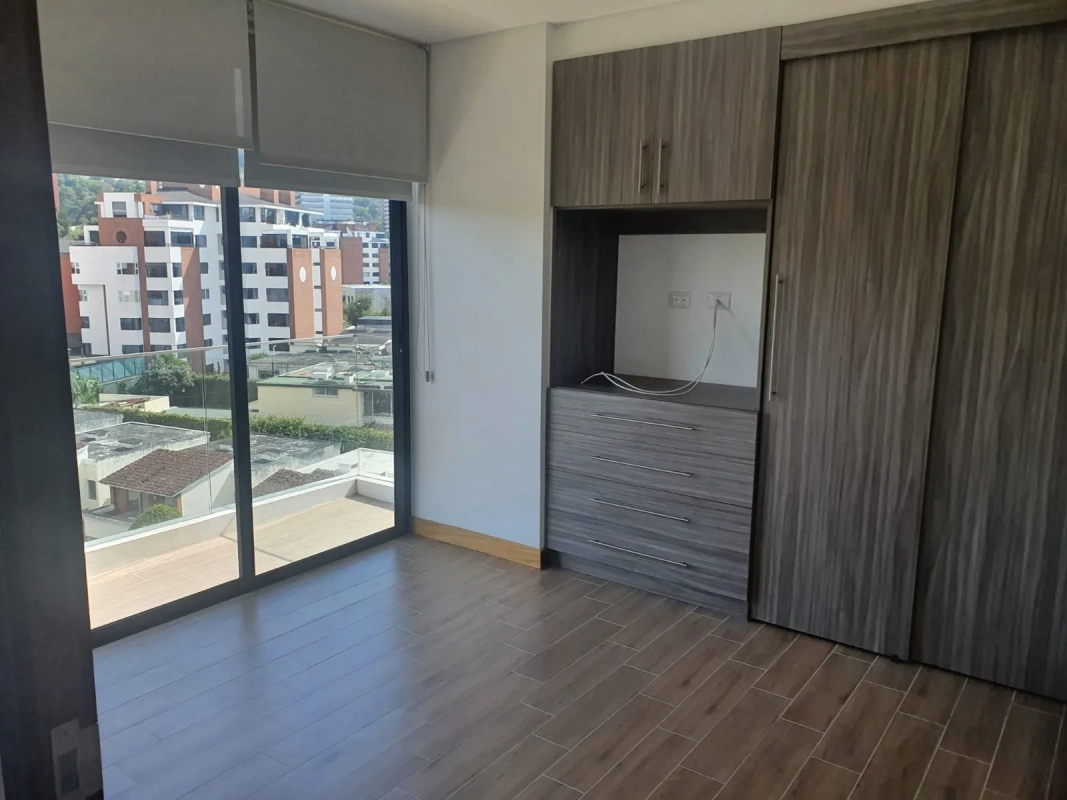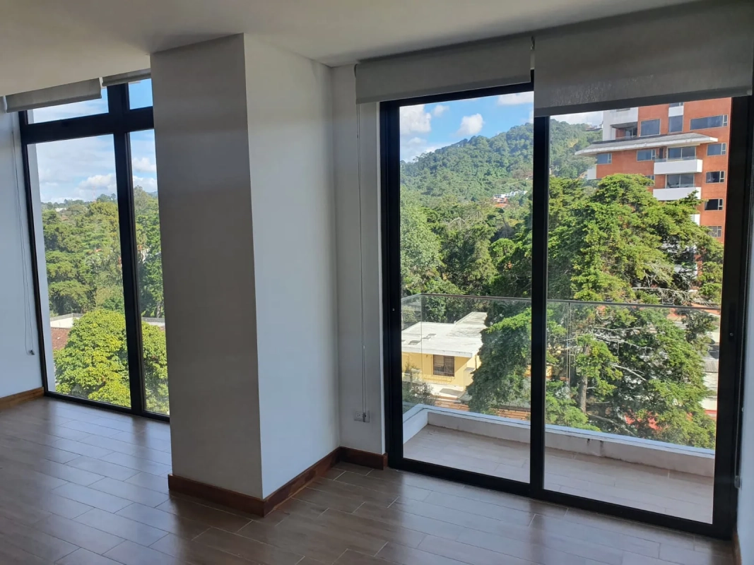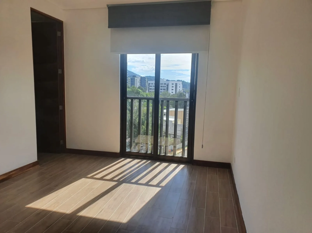 Apartamento de 2 habitaciones cada una con closet y balcón francés, habitación principal con baño integrado, sala con balcón y cocina abierta, 2 parqueos y bodega.