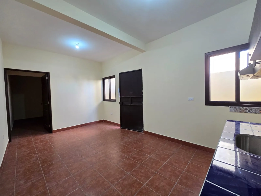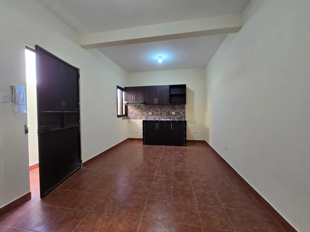 Sala–comedor–cocina con gabinetes, una habitación con closet, un baño.
