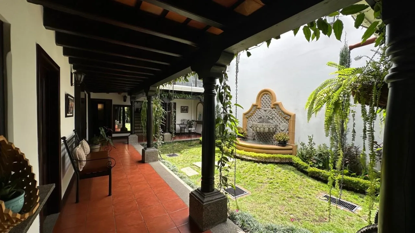 En el primer nivel, la casa te recibe con un garaje que incluye práctico cuarto de lavandería. Encontrarás también una habitación con baño privado, ideal para visitas o para quienes prefieren evitar gradas, con una agradable vista directa al parque. La sala y comedor se integran en un ambiente abierto, lleno de luz natural, con acceso directo a un jardín interior que aporta frescura y armonía a los espacios. La cocina destaca por sus gabinetes bajos y aéreos, además de un elegante techo tipo linternilla octogonal con cúpula, un detalle arquitectónico que realza el estilo colonial de la propiedad.