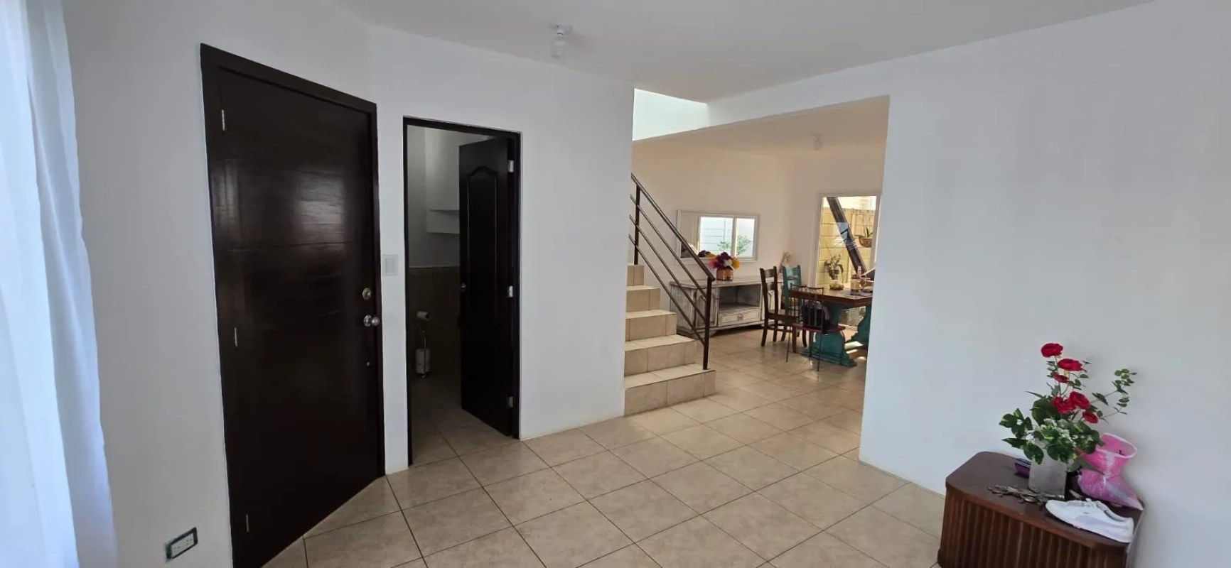 Casa con jardín frontal y posterior, baño de visitas, sala-comedor, cocina con gabinetes, área de lavandería, patio de servicio, pérgola, balcón, closet en dormitorios, ducha.