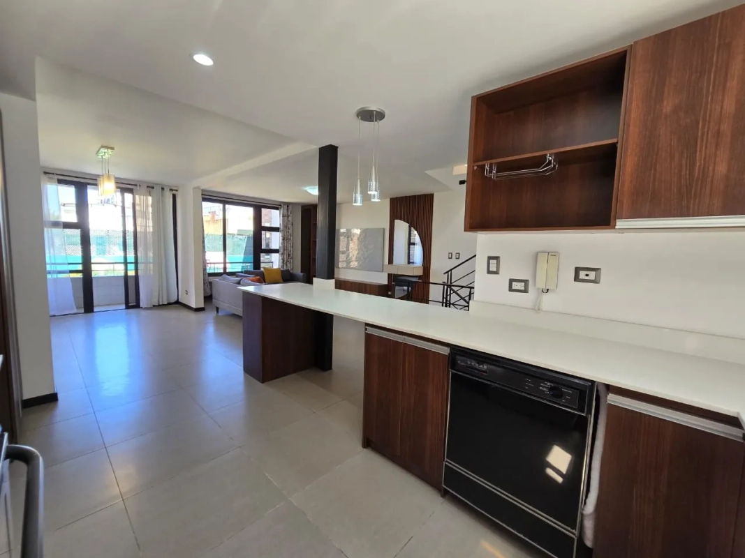 Sala con cava | comedor con balcón | cocina con gabinetes, estufa y campana extractora | Estudio
