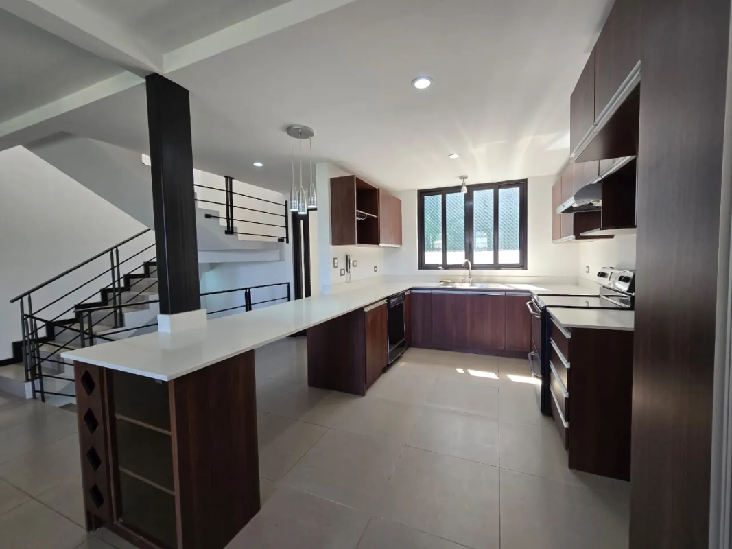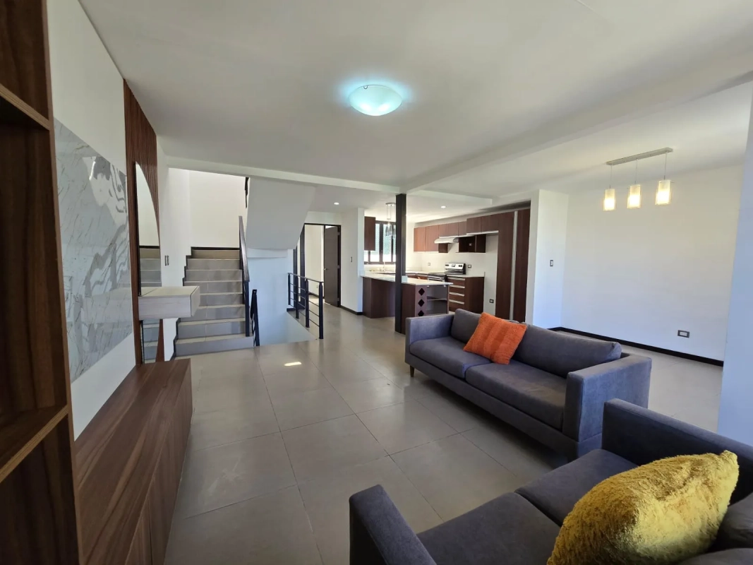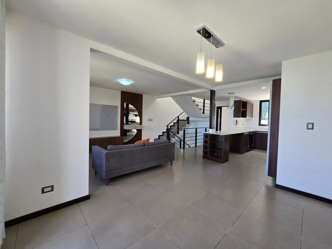 Casa de 3 niveles con finos acabados, lámparas, cortinas, panel solar.