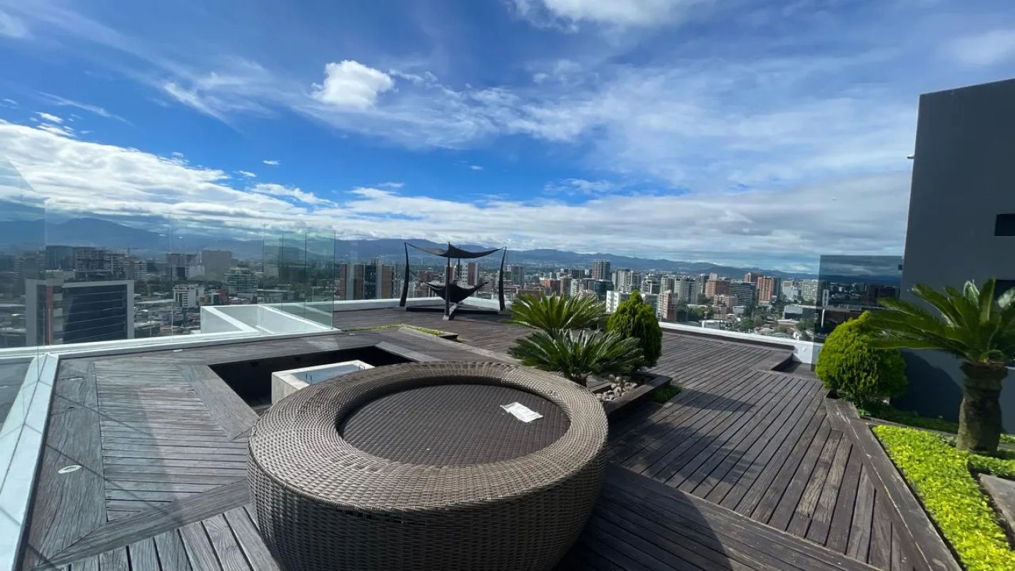Amenidades del edificio: Terraza, piscina, sauna, área social, gym, cafetería, parqueo de visitas.