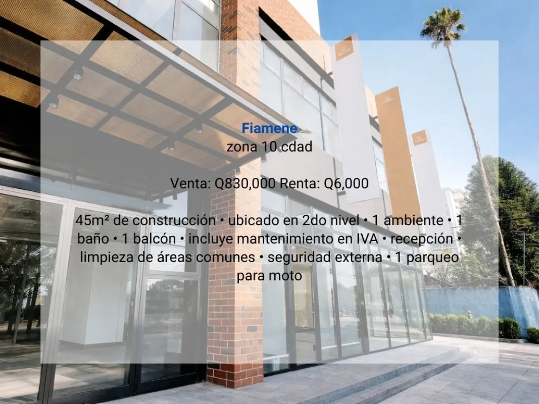 45m² de construcción • ubicado en 2do nivel • 1 ambiente • 1 baño • 1 balcón • incluye mantenimiento en IVA • recepción • limpieza de áreas comunes • seguridad externa • 1 parqueo para moto