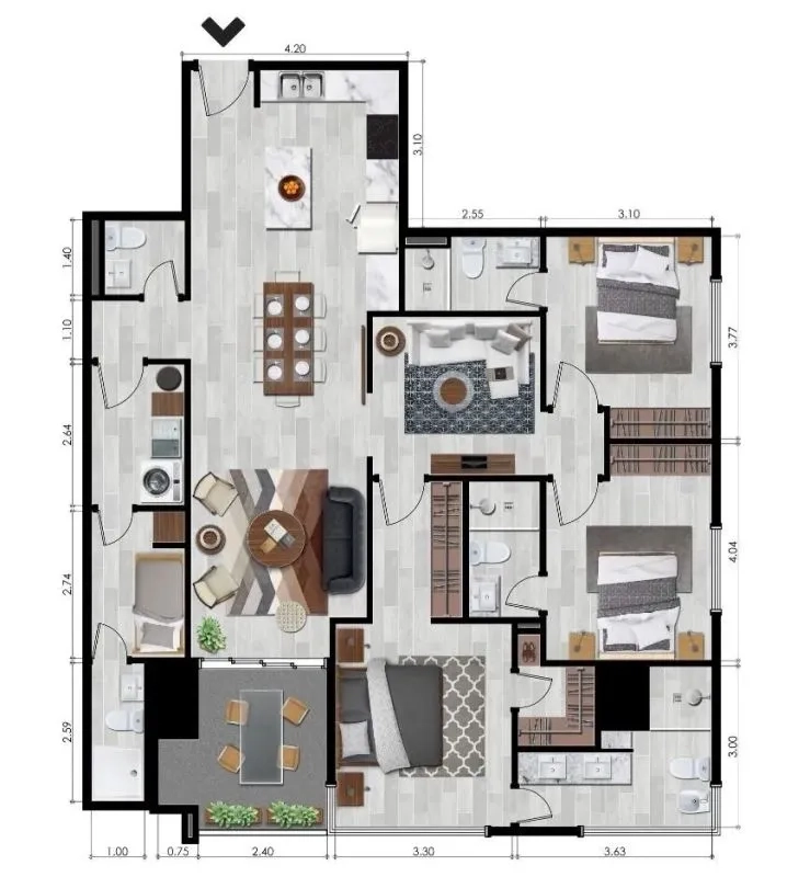 3 habitaciones (Cada una con su baño)