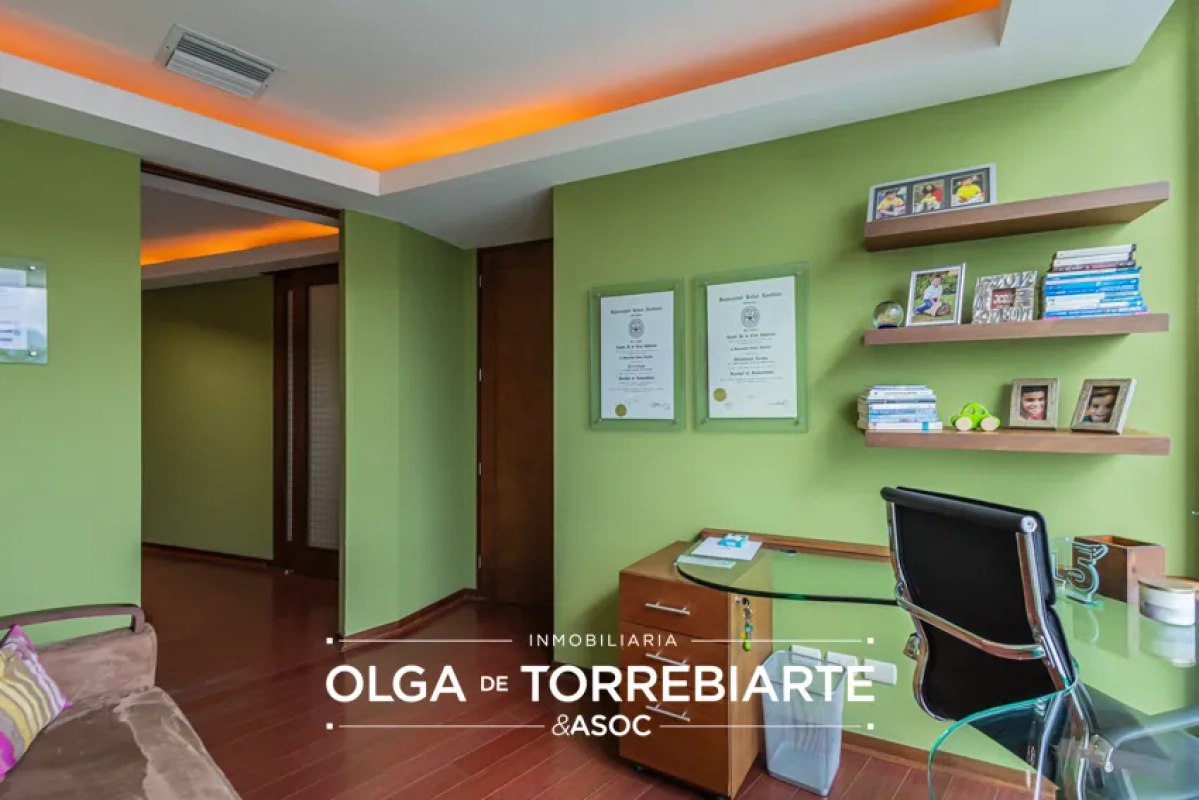 -Oficina principal: amueblada con 1 sofá de 2 personas, mesa lateral aérea de vidrio, escritorio de vidrio con silla ejecutiva, 2 robots de archivador independientes y movibles, cortina, 3 repisas aéreas de madera, piso de madera.
