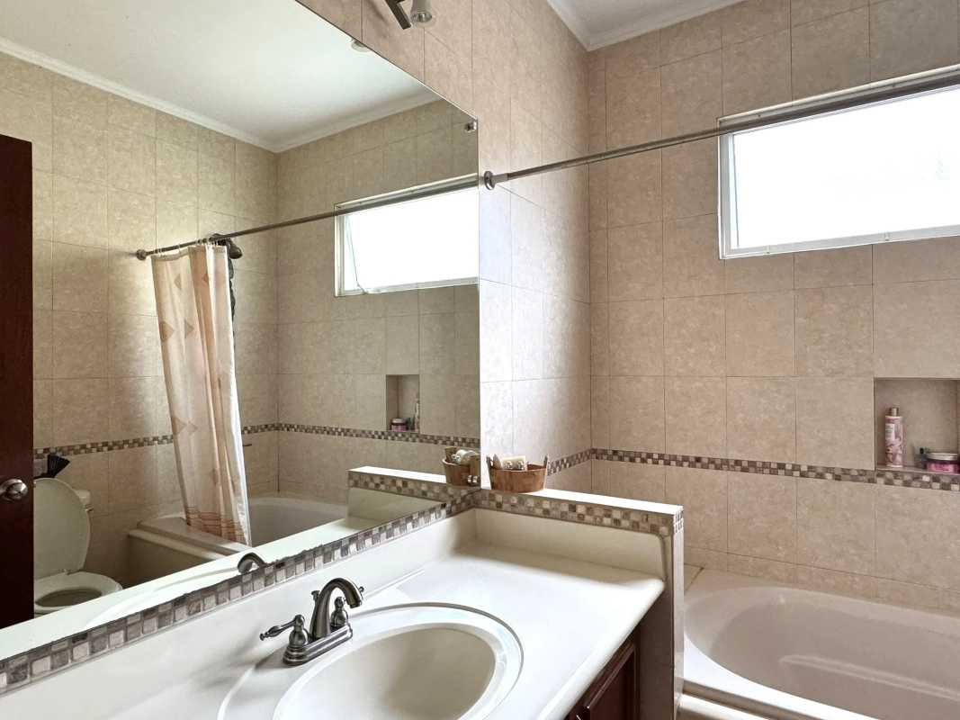 Vendo Linda y amplia casa en un ambiente natural, rodeada de árboles en Carretera a El Salvador, en sector de alta plusvalía, cercano a autopista VAS. Sobre un terreno de 674vrs2, distribuida en dos niveles, la casa de 430 m2 cuenta con vestíbulo, amplios ambientes de sala y comedor, linda cocina con isla, baño de vistas, jardín con pérgola, sala familiar, dormitorio principal con walk-in closet y baño, dos dormitorios secundarios comparten un baño completo y un dormitorio adicional con walk-in closet y baño. Área de servicio completa con lavandería, dormitorio de servicio con baño, entrada de servicio, bodega. La casa se encuentra equipada con: lavadora, secadora, estufa a gas, refrigeradora, lavavajillas, gabinetes de cocina, lámparas, cortinas, calentador de agua, recibidor. El condominio cuenta con lindas amenidades como: Gimnasio, Canchas deportivas, salon social, Juegos infantiles, Piscina, Cancha de tenis y Parqueo de visitas