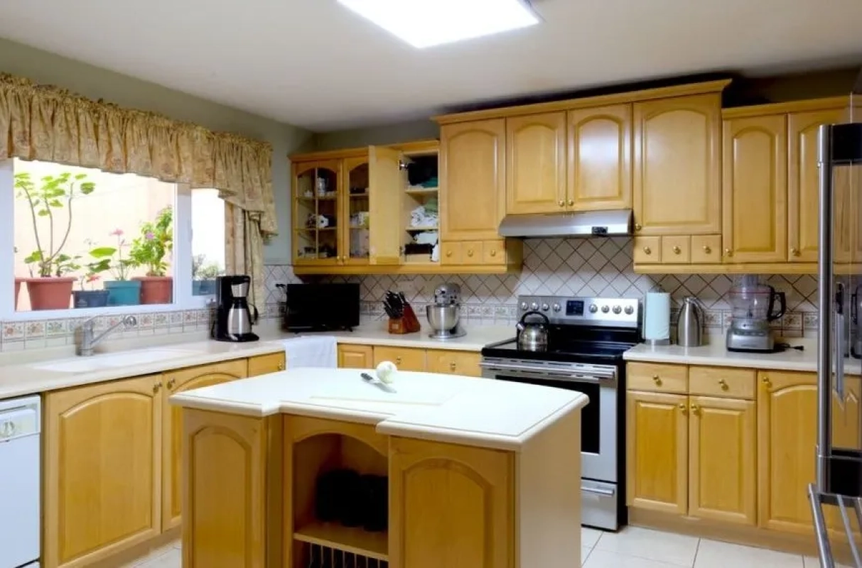 Cocina con gabinetes, isla central e intercomunicador a garita